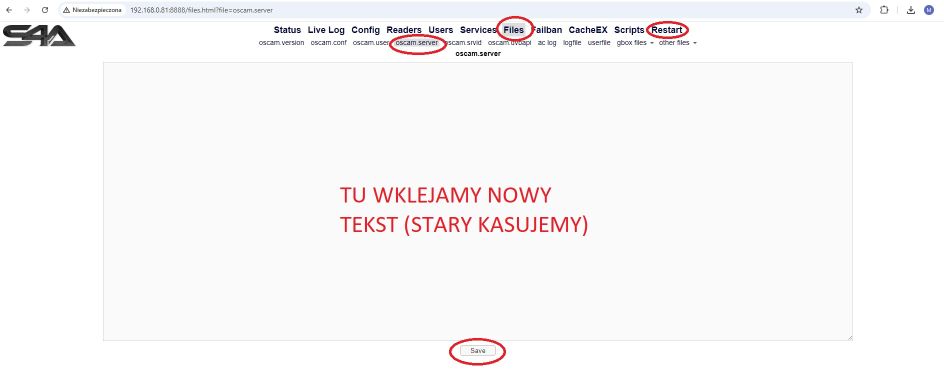 4. WYBIERAMY NA STRONIE: FILES -> OSCAM.SERVER -> WKLEIĆ OTRZYMANE DANE (TEKST) , NASTĘPNIE PRZYCISK SAVE (pod tekstem),