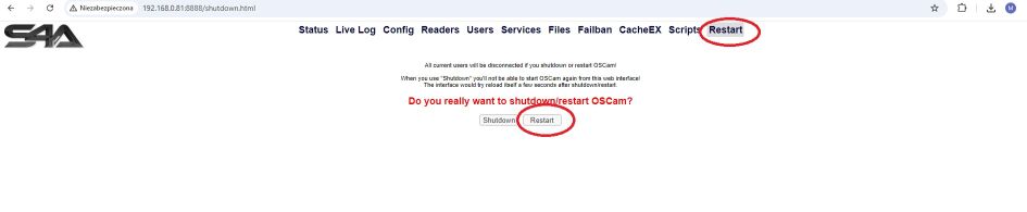 Wybieramy zainstalowany oscam np. 11518 ok i restartujemy nowo zainstalowany oscam np. oscam 11518 (czerwony przycisk restart)