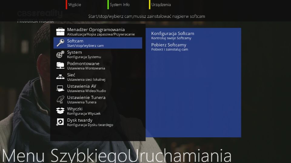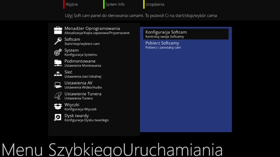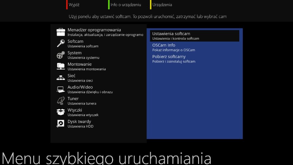 Naciskamy na pilocie niebieski przycisk (ChoiceBox -wybierz rozszerzenie), softcam manager, sprawdzamy czy mamy uruchomione oscam czy freecam (na dole strony select: oscam lub freecam)